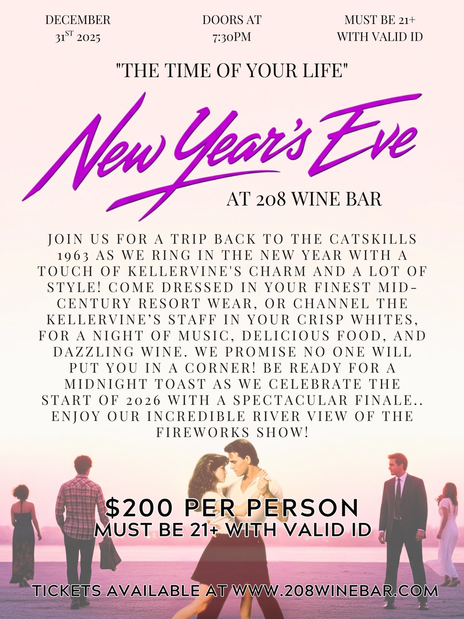 Included with your ticket is: WELCOME BUBBLES • UNLIMITED HOUSE WINE & BEER HEAVY HORS D'OEUVRES BY CHEF NYJEE IMMERSIVE ENTERTAINMENT, GAMES, AND MORE CHAMPAGNE TOAST AT MIDNIGHT And, of course, an incredible river view and fireworks show! DOORS OPEN AT 7:30PM We will welcome guests at 7:30pm with a glass of bubbly or our signature drink. Come dressed in your finest mid-century resort wear, or channel the Kellervine’s staff in your crisp whites, for a night of music, delicious food, and dazzling wine. We promise no one will put you in a corner! Be ready for the midnight toast with true champagne as we celebrate the start of the new year with a spectacular finale.. Enjoy our incredible river view of the fireworks show! Dress to impress your favorite Dirty Dancer! Themed attire/costumes are encouraged! Event is Wednesday 12/31/25 from 7:30pm until approx. 12:30am. Tickets are will-call; must be 21+.07:30 PM - 12:30 AM